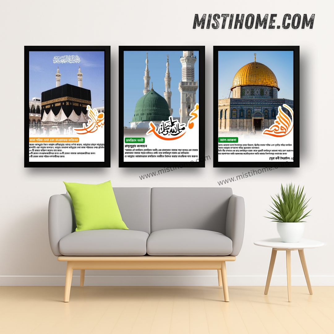 আধুনিক ডিজাইন ও ইসলামী সৌন্দর্যের অনন্য সমন্বয় এই ওয়াল আর্ট ফ্রেমগুলো আপনার ঘর, অফিস বা মসজিদের দেয়ালে এনে দেবে প্রশান্তি ও আভিজাত্যের ছোঁয়া। উচ্চমানের প্রিন্ট ও প্রিমিয়াম ফ্রেমিং নিশ্চিত করে দীর্ঘস্থায়ী ব্যবহার।